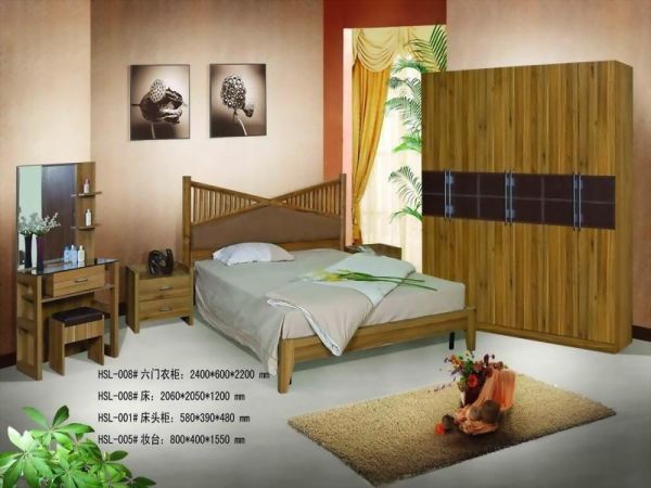 Product Name: Bedroom Set 1pc double bed 2 pcs night stand 6 doors wardrobe 1pcs dresser 1pcs stool 1pcs chest of drawer Ourside Packing: Standard export caton, knock down style.
